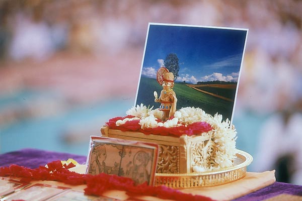 Shri Harikrishna Maharaj adorned in sandalwood paste in Swamishri's morning puja