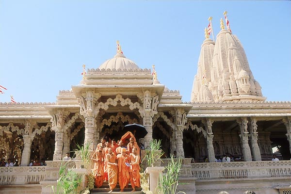 Swamishri descends the mandir steps for pratishtha of Shri Nilkanth Varni in Rang Mandap