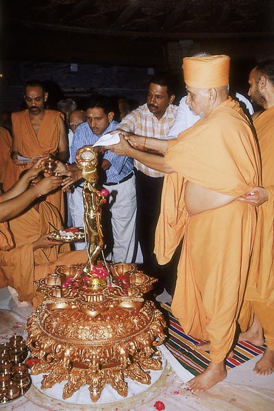 Swamishri performs first abhishek ritual of Shri Nilkanth Varni