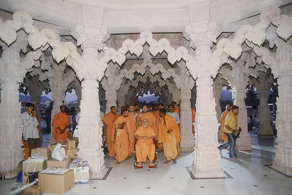 Swamishri observes the mandir and Shri Harikrishna Maharaj placed in the sinhasan of central shrine
