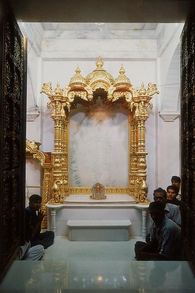 Swamishri observes the mandir and Shri Harikrishna Maharaj placed in the sinhasan of central shrine