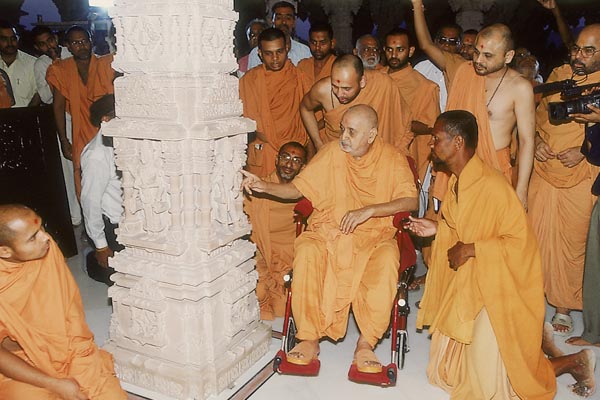 Swamishri observes the mandir and Shri Harikrishna Maharaj placed in the sinhasan of central shrine