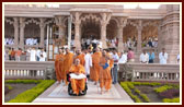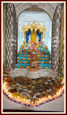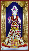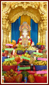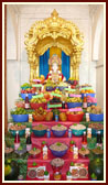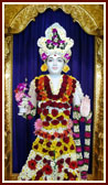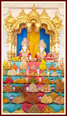 | Children with parents during vartman vidhi | Swamishri after Thakorji's darshan | Bhagwan Swaminarayan and Aksharbrahman Gunatitanand Swami adorned with flowers | ||||
