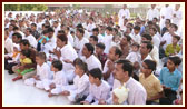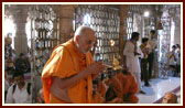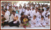 | Swamishri performs arti of Thakorji | Children with parents for satsang initiation ritual | Swamishri initiates children into satsang by performing vartman vidhi | ||||