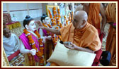 | Swamishri performs murti-pratishtha rituals for new hari mandir at Bareja | ... Kaligam | Swamishri performs the pratishtha arti | ||||
