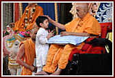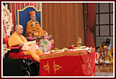 | Children sing kirtans during puja | Children on stage | Swamishri bids Jai Swaminarayan | ||||