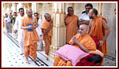 | Swamishri engaged in darshan of Shri Nilkanth Varni | Pujya Tyagvallabh Swami welcomes Swamishri with a garland | Swamishri on mandir grounds | ||||