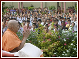 | Swamishri on his way for the Sunday satsang assembly | Swamishri blesses the Sunday satsang assembly | |||||