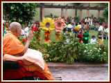 | Sadhus engaged in Swamishri's darshan in mandir pradakshina | ||||||