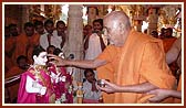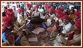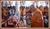 | Devotees sing bhajans in a traditional style (ochhchhaviyas) on ekadashi | Swamishri blesses devotees | |||||