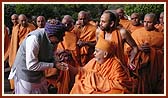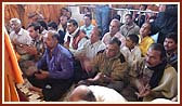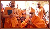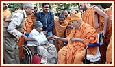 | Despite his illness Swamishri came for Thakorji's darshan daily | Swamishri blesses a devotee from a village | |||||
